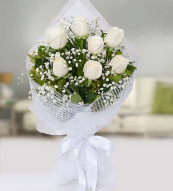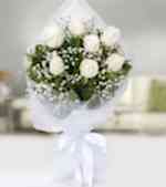 7 Adet beyaz güller ve yeşillikler ile hazırlanmış şık el buketi.