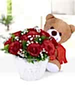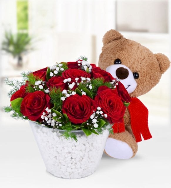 12 adet kırmızı gül, 1 adet peluş ayıcık, 5 adet cipsofilya ve yeşilliklerle hazırlanmıştır.