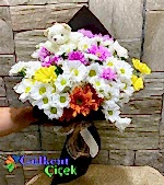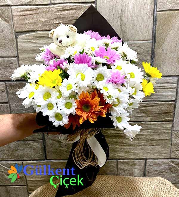 RENKLİ PAPATYALAR VE AYICIKLI ÇİÇEK BUKETİ