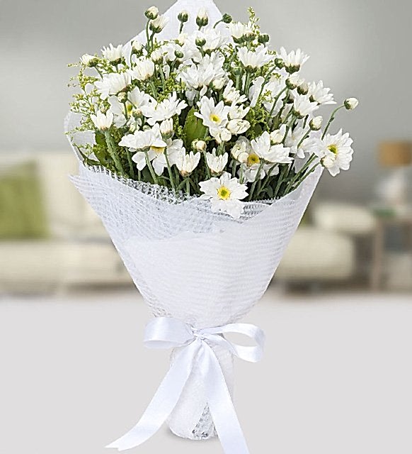 1 Demet beyaz papatyalar ve yeşillikler ile hazırlanmış kır çiçeği buketi.
