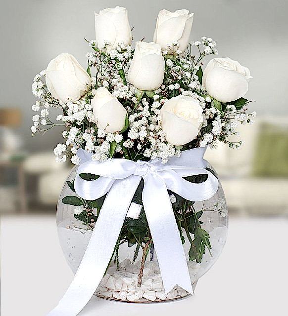 Fanus cam içerisine beyaz çakıl taşları ve 7 adet beyaz güller ile hazırlanmıştır.