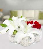 Kalp obje içerisine 5 adet kırmızı gül, 2 adet beyaz lilyum ile hazırlanmış çiçek aranjmanı.
