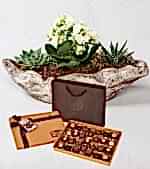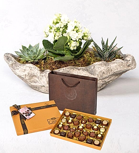 kayık saksı da 2 adet kalanşo ve çikolata kutusu