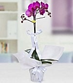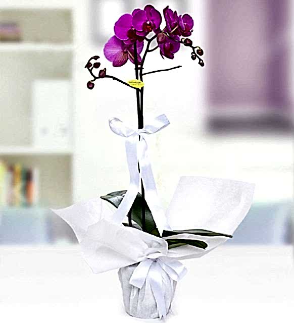 Saksı içerisinde 55 cm yüksekliğindeki topraklı mor orkide.