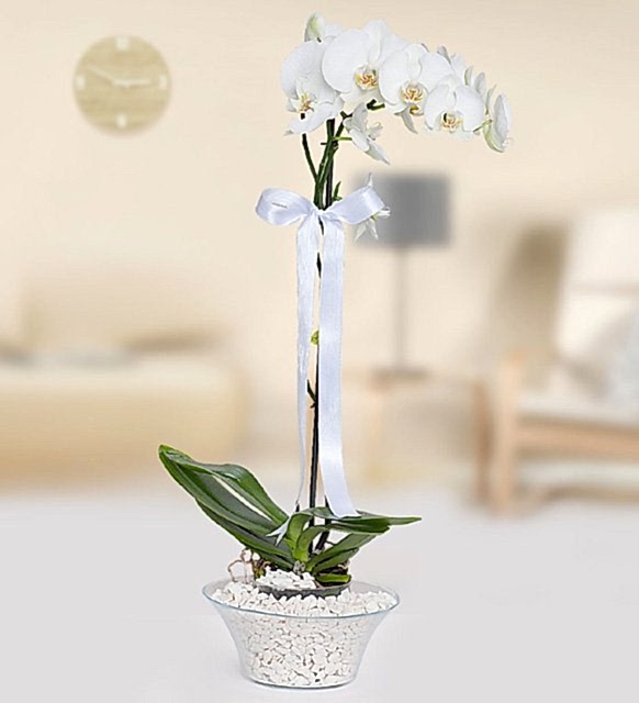 Cam içerisine 65 Cm uzunluğunda beyaz orkide ile hazırlanmıştır.
