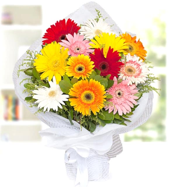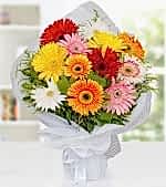 12 Adet karışık gerberalardan oluşan içinde yeşillikler bulunan el buketi.