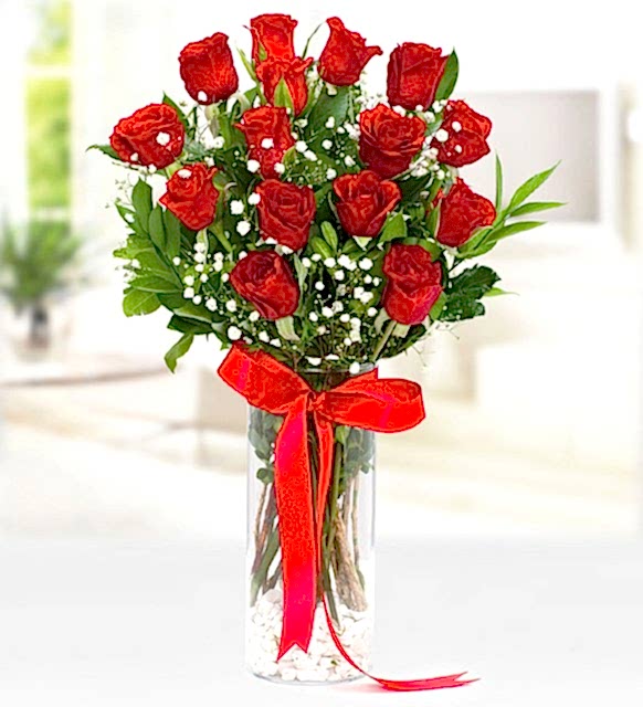 Cam vazo içerisinde 15 adet butik kırmızı güller ve renkli taşlarla hazırlanmış şık çiçek aranjmanı.