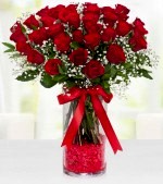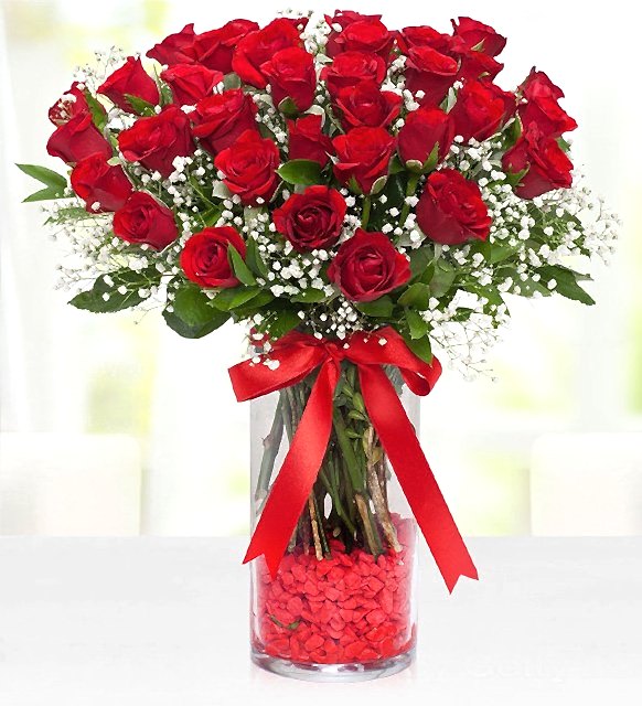 Cam vazo içerisinde 41 adet kırmızı güller ve cipsofilyalar ile hazırlanmıştır.